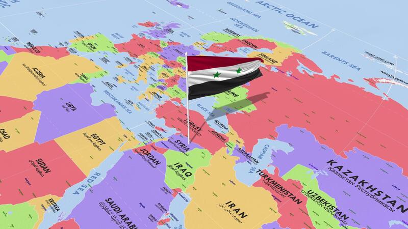 Syria Flag Waving in Wind, World Map Rotating around Flag, Seamless Loop, 3D Rendering Free Video