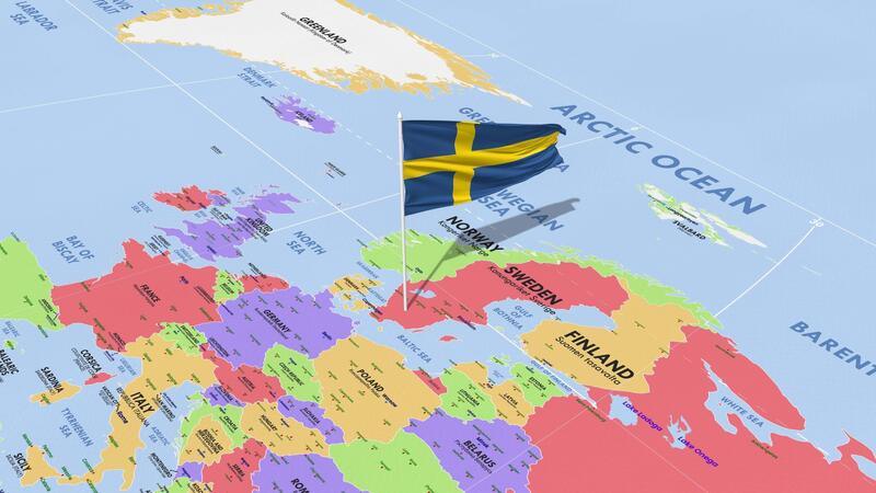 Sweden Flag Waving in Wind, World Map Rotating around Flag, Seamless Loop, 3D Rendering Free Video