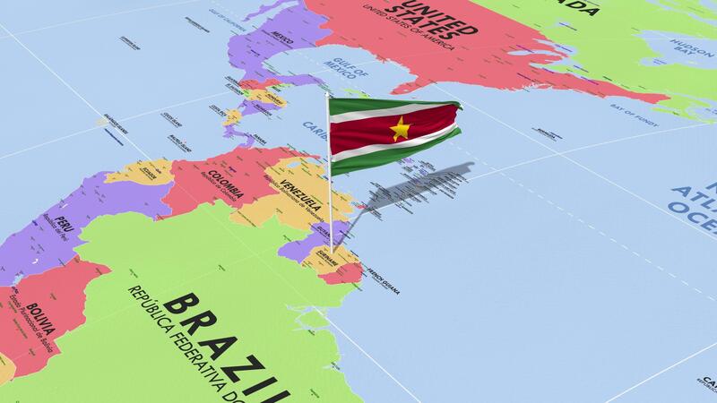 Suriname Flag Waving in Wind, World Map Rotating around Flag, Seamless Loop, 3D Rendering Free Video