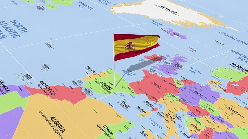 Spain Flag Waving in Wind, World Map Rotating around Flag, Seamless Loop, 3D Rendering Free Video