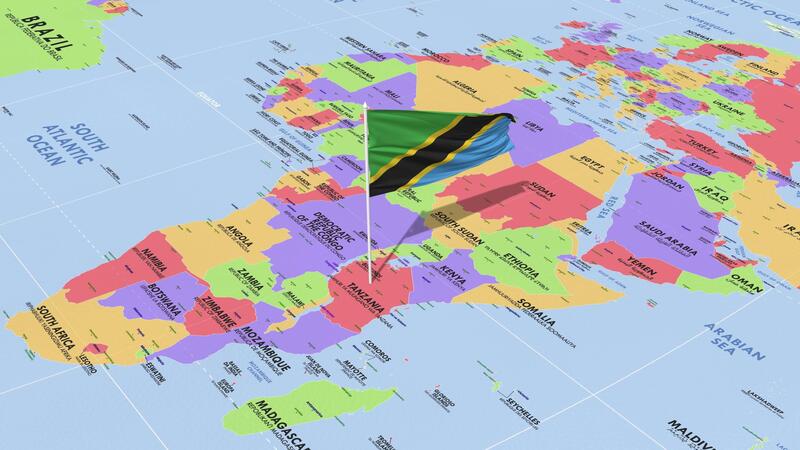 Tanzania Flag Waving in Wind, World Map Rotating around Flag, Seamless Loop, 3D Rendering Free Video