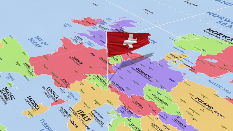 Switzerland Flag Waving in Wind, World Map Rotating around Flag, Seamless Loop, 3D Rendering Free Video