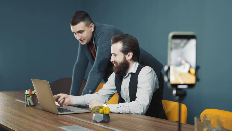 Broadcast a meeting of two young people discussing a business strategy while working with a notebook. Capture a conference on a mobile phone. Pro Video