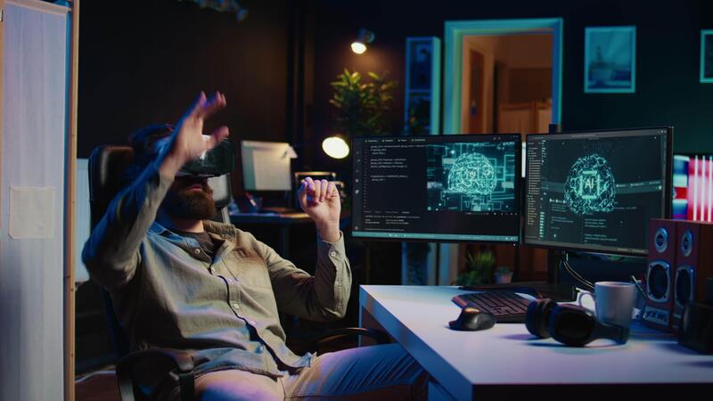 IT expert using virtual reality to make artificial intelligence become sentient, smiling after seeing self awareness signs. Man with VR glasses on happy after achieving AI superintelligence, camera B Pro Video
