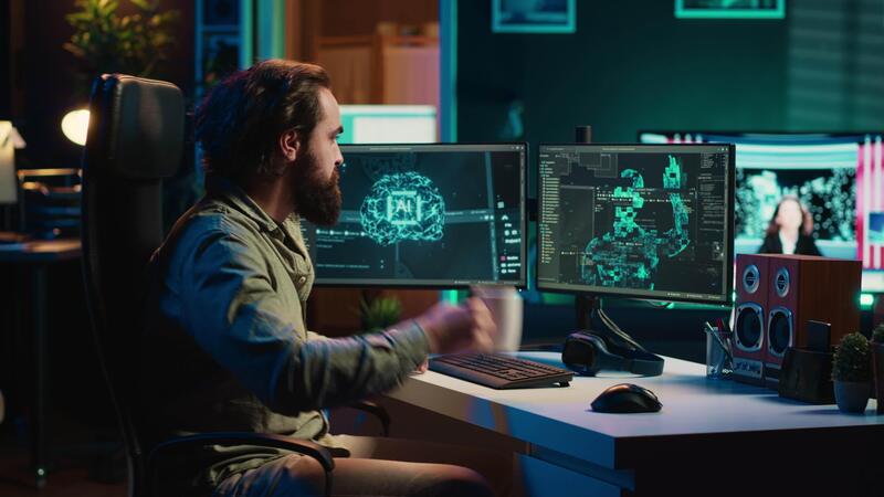 Self aware AGI AI gaining humanoid form inside cyberspace, waving hand, shocking man while drinking coffee. Artificial intelligence becoming sentient, flustering admin spamming keyboard, camera A Pro Video
