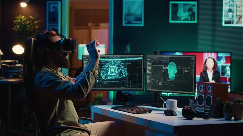 Developer using VR headset panicking after sentient artificial intelligence gains autonomy, threatening humanity. Programmer using virtual reality tech worried about AI having consciousness, camera A Pro Video