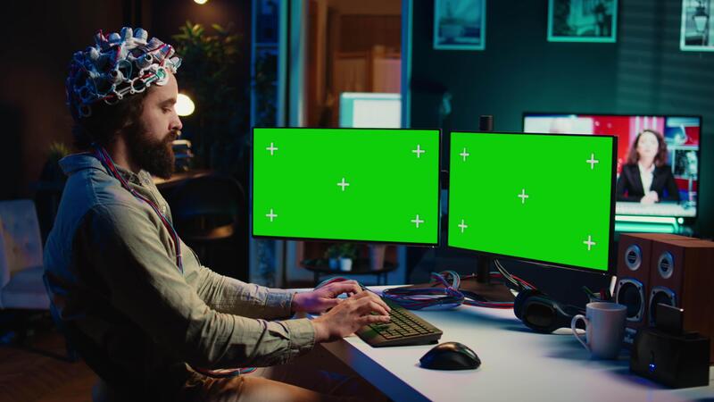 Engineer with EEG headset on programming brain transfer into computer virtual world on isolated screen monitors. Transhumanist using neuroscience to gain digital soul through chroma key PC, camera B Pro Video