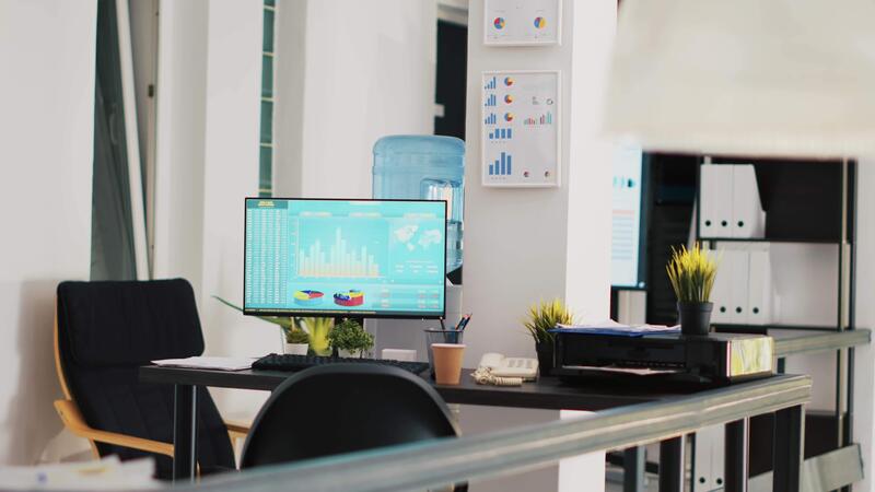 Economic stock market data collected in empty office to develop trading strategies and algorithms, panning shot. PC screen in company workplace showing trading platform and pie charts graphs Pro Video