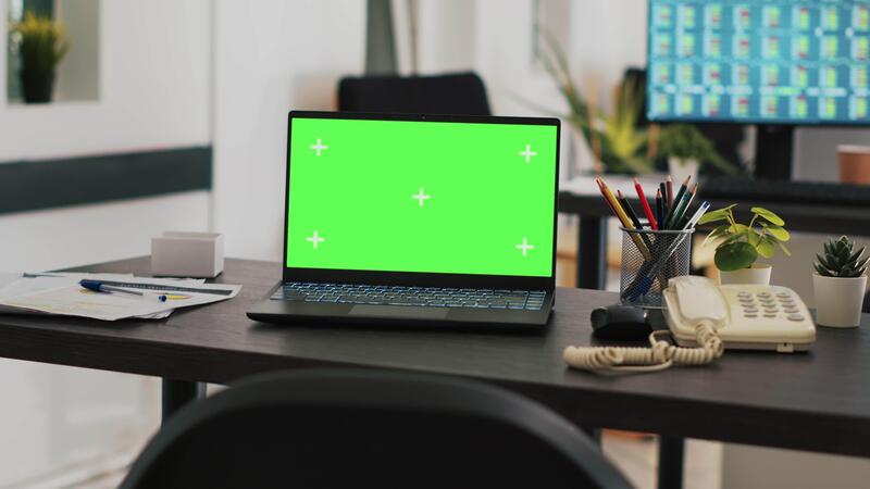 Office with green screen laptop on desk and monitor in background with stock exchange listings. Mockup notebook in workspace and computer screen in background displaying trading platform Pro Video