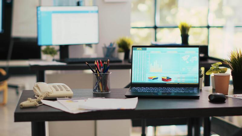 Stock market diagrams with charts and stock figures on laptop showing profits, empty workspace. Trading index listings displayed on notebook screen in office, panning shot Pro Video