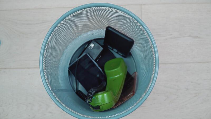 Trash can with mobile phones of different eras revolves around its axis Pro Video