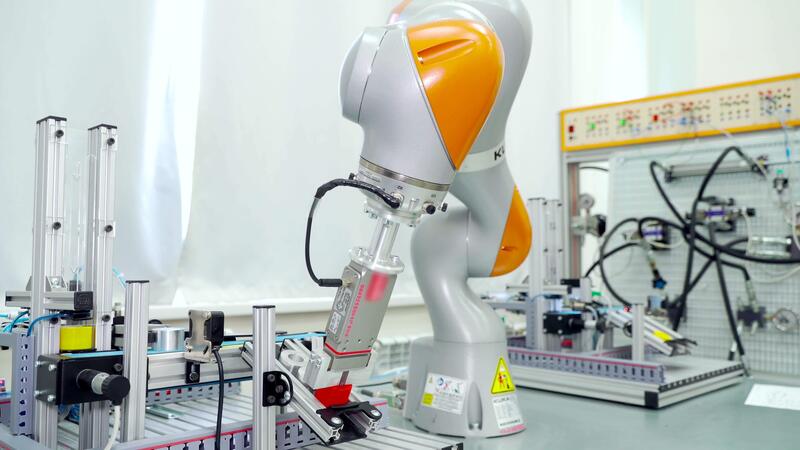 Modern automated hand in enterprise. Scene. Automated robot arm for rearranging finished parts in modern factory. Modern robot technology in work at enterprise Pro Video