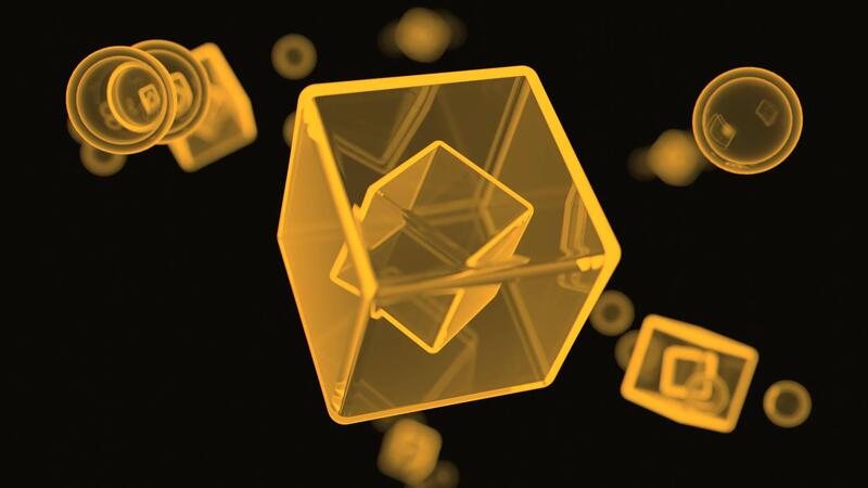 3D cubes rotating in virtual space. Design. Transparent cubes and round bubbles. Pro Video