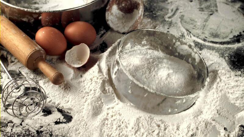 Super slow motion sieve falls on the table with flour and eggs. Macro background. Filmed on a high-speed camera at 1000 fps. Pro Video