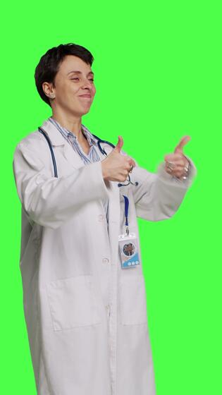 Side view Cheerful medic doing thumbs up symbol against greenscreen backdrop, expresses positivity with like sign. General practitioner with coat giving approval and being satisfied with success. Camera B. Pro Video