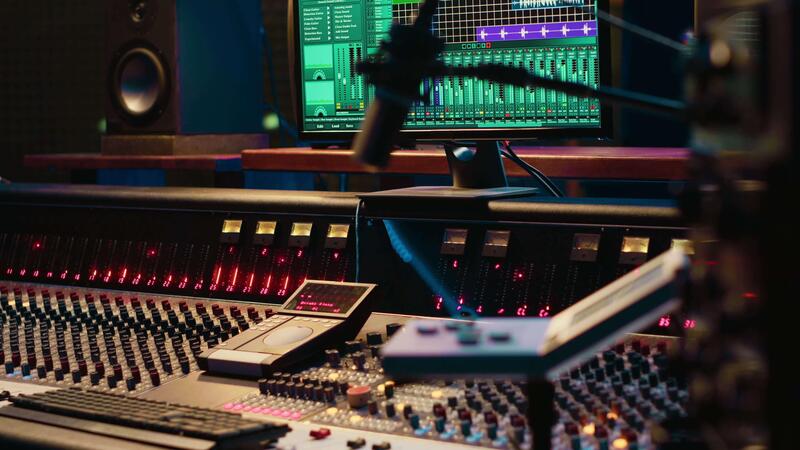 Empty control room running daw software interface on monitor to use in recording and editing audio files, adjusting volume levels. Professional studio having sliders and equalizer. Pro Video