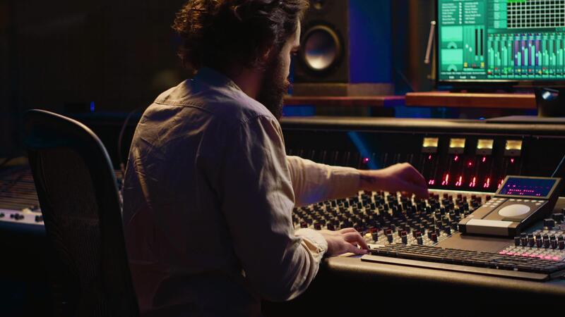 Mixing engineer focuses on blending and balancing individual tunes of a recording to create song, audio editing software in control room. Expert deals with technical aspects of sound. Camera A. Pro Video