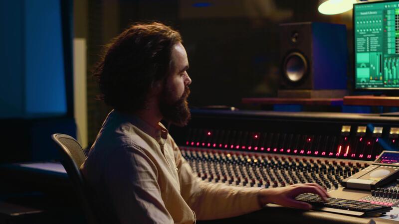 Sound designer processing and mixing tunes in control room, working on a new album in professional recording studio. Audio expert using control panel board with buttons and sliders. Camera A. Pro Video