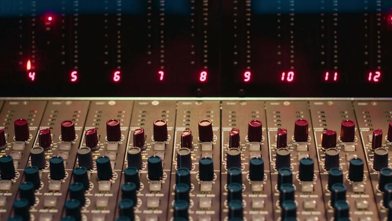 Empty professional studio with control desk mixer and pre amp knobs, music recording and editing with audio software. Control room buttons and sliders in post production, soundproof space. Pro Video