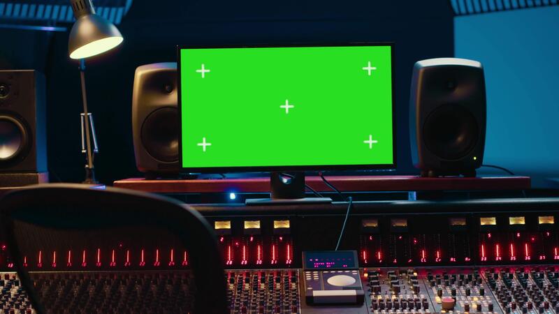 Control room with greenscreen running on computer next to buttons and sliders, multiple controls and switchers on panel board mixing console. Empty professional studio with stereo gear. Camera A. Pro Video
