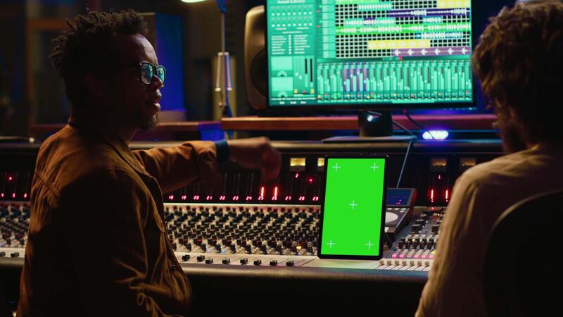 Team of producer and artist use tablet with mockup display in professional studio, mixing and mastering tracks after recording session. Experts working in control room with console. Camera A. Pro Video