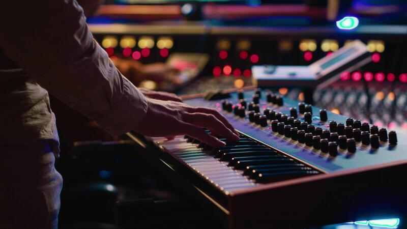 Skilled artist playing piano electronic keyboard in control room, recording new tracks with midi controller and mixing console. Young musician practicing on synthesizer in record studio. Camera A. Pro Video