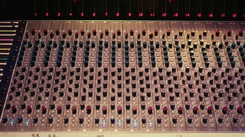 Empty professional studio with control desk mixer and pre amp knobs, music recording and editing with audio software. Control room buttons and sliders in post production, soundproof space. Pro Video