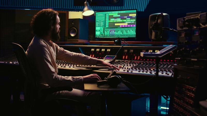 Sound designer processing and mixing tunes in control room, working on a new album in professional recording studio. Audio expert using control panel board with buttons and sliders. Camera B. Pro Video