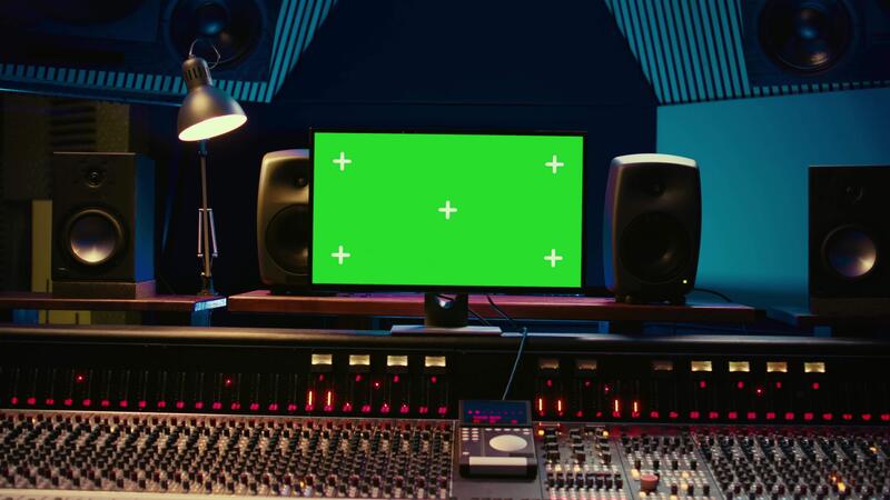 Empty professional recording studio control room with greenscreen on display, editing and processing tracks. Motorized faders, buttons and sliders operated for mix and master techniques. Camera B. Pro Video