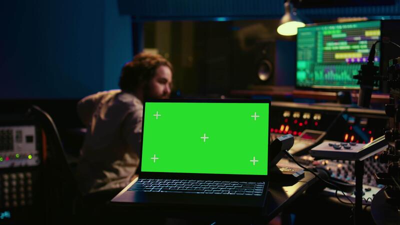 Sound designer uses audio mixer and greenscreen layout in professional studio, adjusting volume levels while pressing buttons on desk. Control room equipped with technical recording gear. Camera B. Pro Video