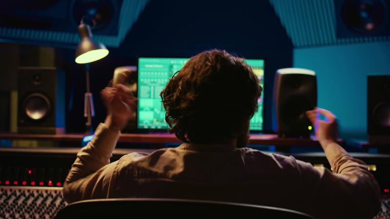 Cheerful energic audio engineer dancing on his own music creation in professional studio, editing a recording on mixing console and daw software. Sound designer processing tracks. Camera B. Pro Video