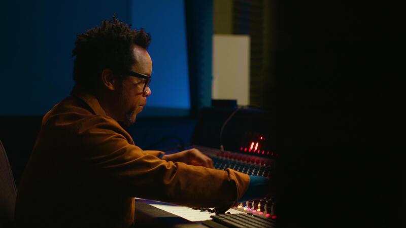 Portrait of professional sound engineer recording tracks and editing tunes by adjusting volume levels with knobs. Producer creating music with mixing console in post production studio. Camera A. Pro Video