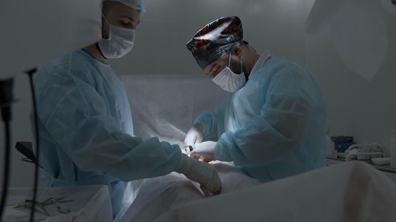 Operation process in medical clinic. Action. Specialists perform an operation, using medical instruments in operating room. Pro Video