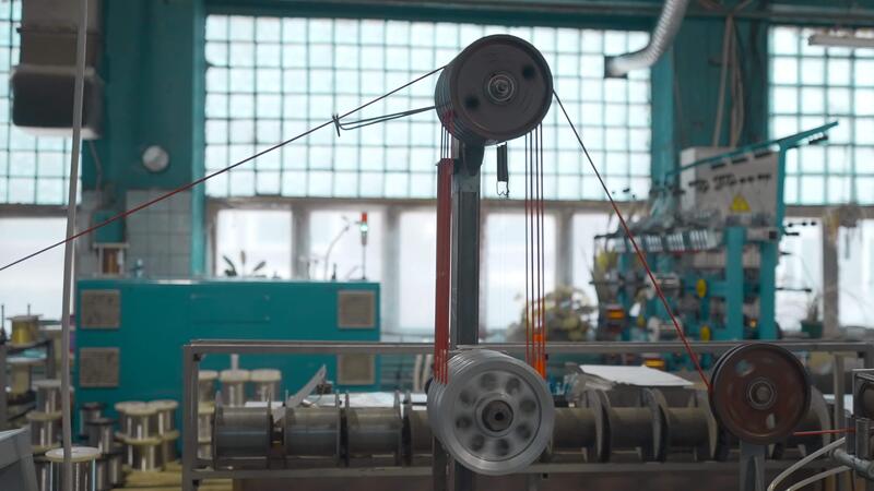Industrial machine with rotating coils and wire. Creative. Industrial winding of wires and cables on machine tools. Automated machines with bobbins and wires at factory Pro Video