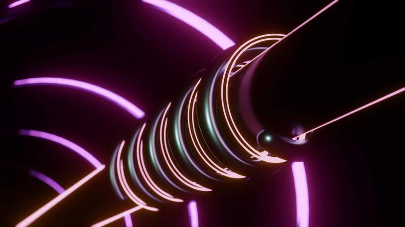 Animation of rotating tubes with piston. Design. Mechanical structure with rotating tubes around rod. Tunnel with metal pipe and moving neon lines Pro Video