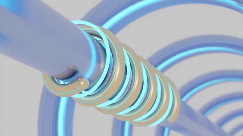 Animation of rotating tubes with piston. Design. Mechanical structure with rotating tubes around rod. Tunnel with metal pipe and moving neon lines Pro Video