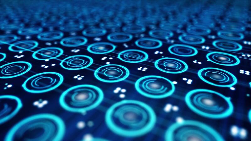 Texture with many small, digital spinning blue circles and moving dots on dark blue background. Close up for abstract electronic scheme with rotating neon circles. Pro Video