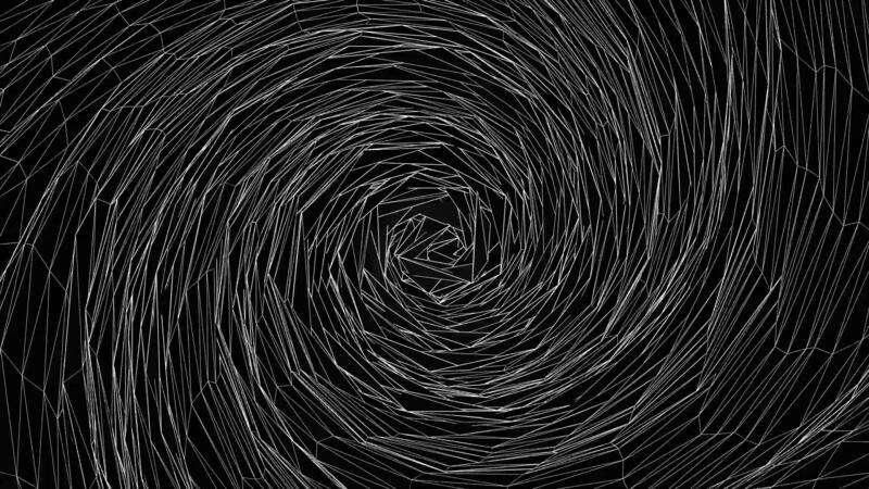 Abstract spiral tunnel spinning with narrow, neon, white lines in the form of triangles in the center, seamless loop. Endless funnel rotating on black background, monochrome. Pro Video