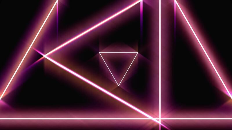 Flying through glowing rotating neon triangles in a tunnel, red pink violet spectrum, seamless loop. Animation. Fluorescent ultraviolet light of moving fast geometrical figures on black background. Pro Video