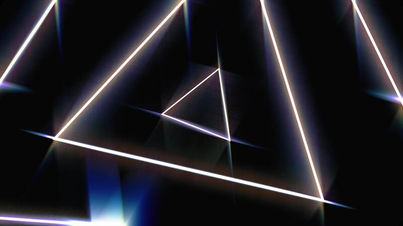 Flying through glowing rotating neon triangles in a tunnel, red pink violet spectrum, seamless loop. Animation. Fluorescent ultraviolet light of moving fast geometrical figures on black background. Pro Video