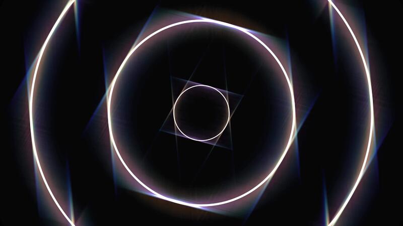Abstract neon background with white glowing circle frames widen on black background, seamless loop. Animation. Neon luminous swirling lines fast movement, monochrome. Pro Video