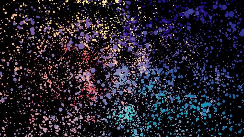 Many blue, yellow, red, lilac rotating particles in space on black background. Animation. Colorful cloud of small circles spinning, seamless loop. Pro Video