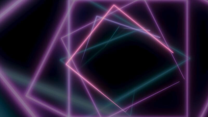 Moving neon simple square gates, forming a tunnel, seamless loop animation. Neon, colorful squares flying and rotating on bkack background. Pro Video