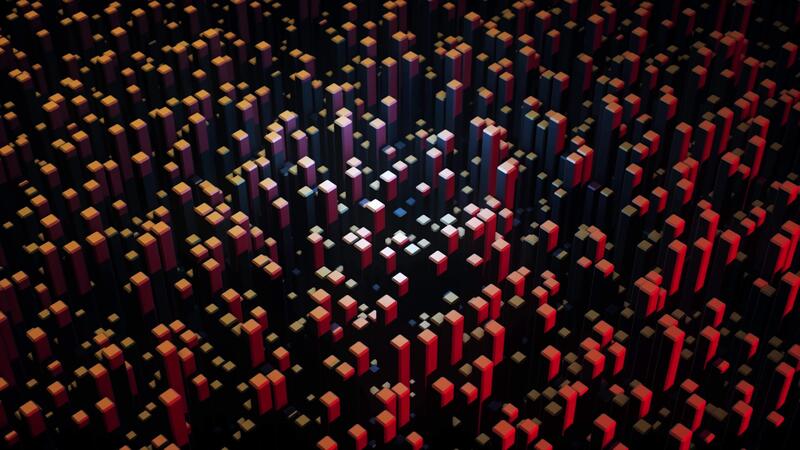 Many abstract rectangular blocks, optical Illusion, modern computer generated 3D backdrop. Animation. Many red growing volume figures on black background. Pro Video