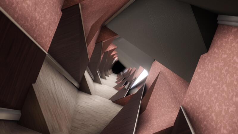 Abstract spinning tunnel inside the house corridor. Animation. Surreal rotatting hallway in the building, 3D motion graphics, concept of modeling and design, seamless loop. Pro Video