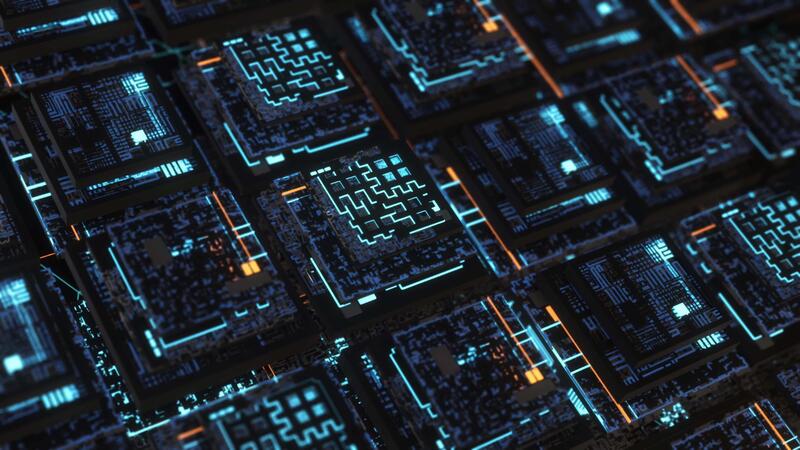 Neon boards in computer. Animation. Beautiful 3D neon boards in computer cyber space. Illuminated memory cards inside computer Pro Video