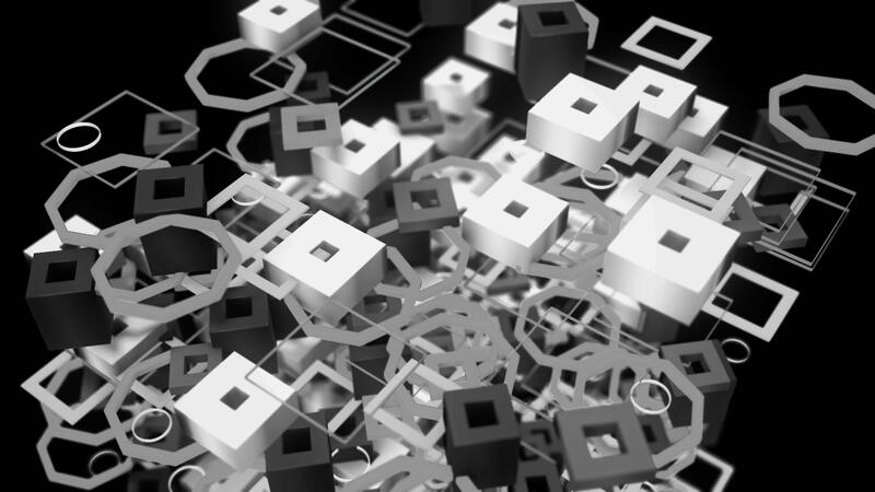 Unusual abstraction of a giant figure made of small different white details moving down isolated on black background. Animation. Abstract constructor, monochrome motion graphics. Pro Video
