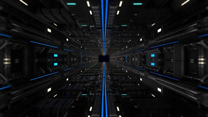 Moving through high-tech tunnel. Animation. Futuristic tunnel with black metal details and neon lines. Tunnel in style of future with neon lines Pro Video