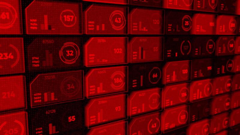 Abstract red rows of small cells with different numbers flowing down slowly on black background, seamless loop. Animation. Futuristic background, cyber technologies concept. Pro Video