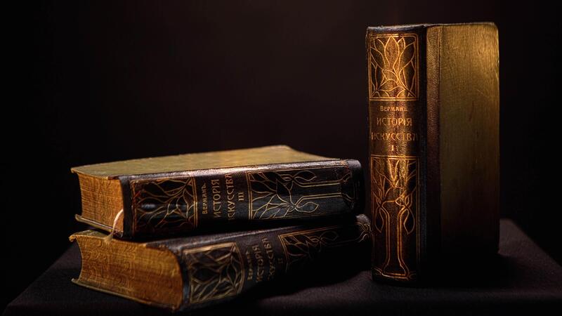 Vintage books with dark leather binding and patterns on isolated background. Stock footage. Old book with simple gilded patterns on cover Pro Video